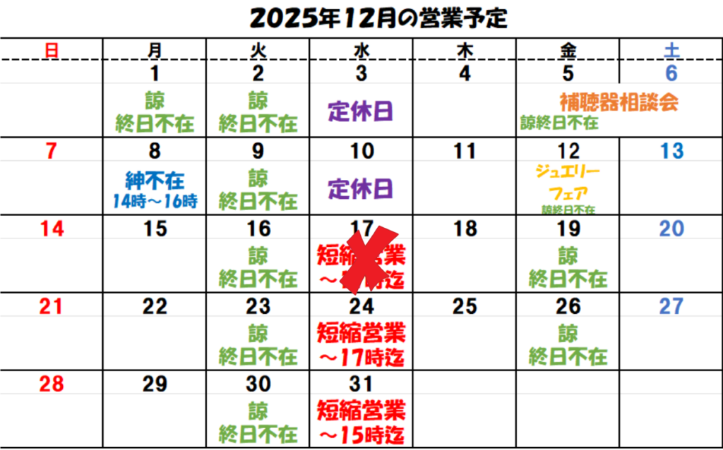 12月の営業予定につきまして、変更がございますのでご連絡させていただきます。