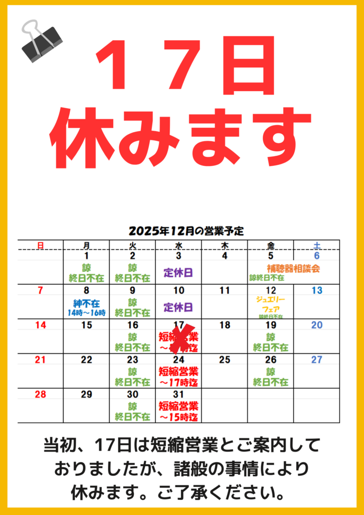 12月の営業予定につきまして、変更がございますのでご連絡させていただきます。